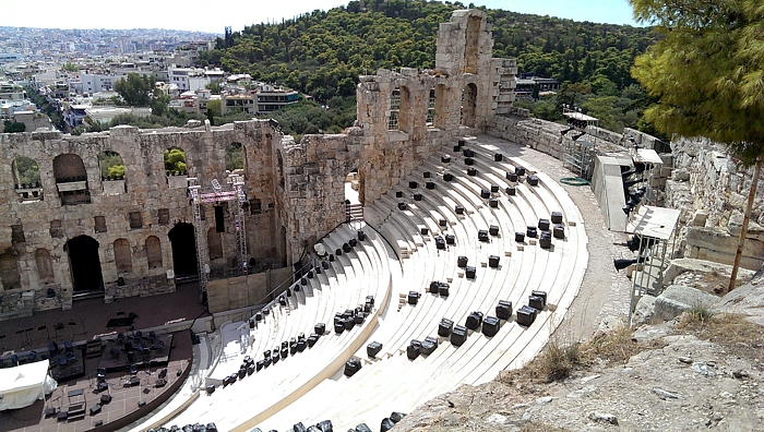 Po cestě na Akropolis začíná pršet a s postupem času déšť houstne až do pořádného lijáku. Že by se mi chtělo už ráno být úplně promočený, tak to tedy ne, ale protože s sebou neberu pláštěnku, asi mi nic jiného nezbude. Asi po 25 minutách přijíždíme na parkoviště, odkud je to ještě asi 5 minut pěšky do kopce. Nasazuji trochu rychlejší tempo a u Herodova divadla se po vyprázdnění močového měchýře schovám po strom.