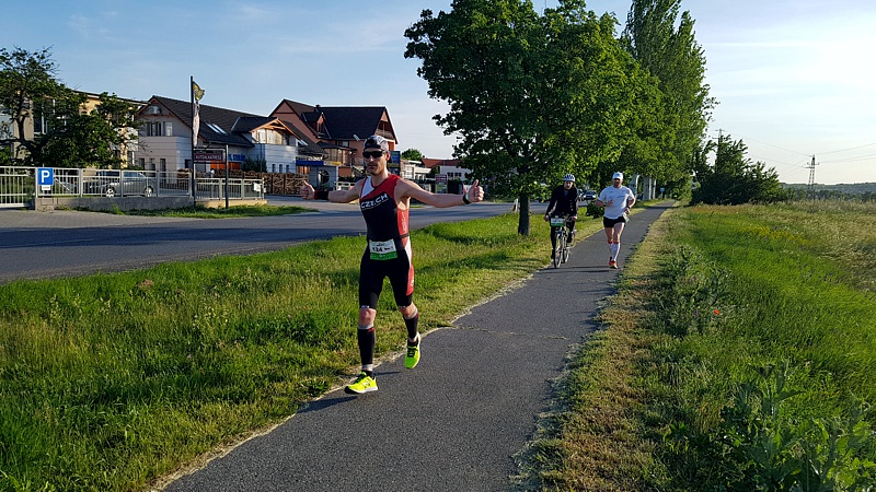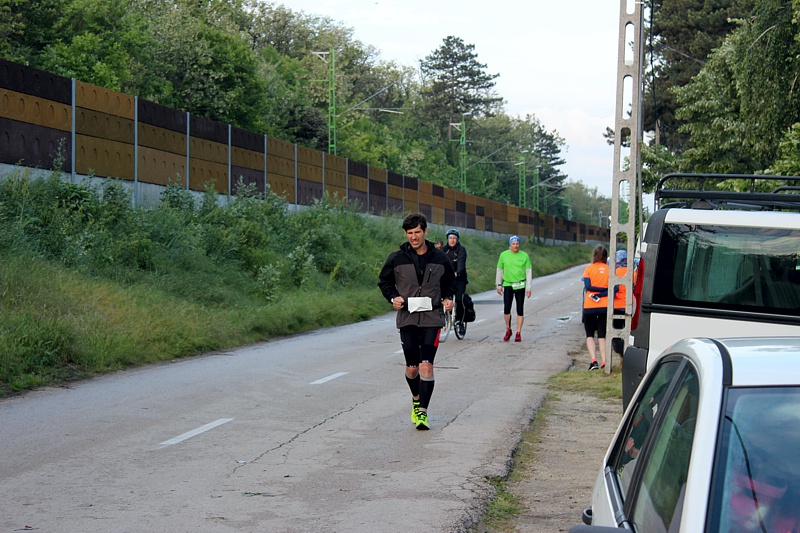 Už vím, že se nyní odkloníme od jezera a vydáme se do místních kopečků. Moje podpora mě napájí a krmi, takže nemusím ztrácet čas na občerstvovačkách. Pořád fučí, ale už jsem si zvykl. Nejsem si jistý, ale zdá se, že se pohybuji vepředu pole. Na hodinky se snažím dívat co nejméně. Do kopečků se snažím běžet, i když vím, že to asi není ten nejlepší nápad. Po vesnicích na vršcích a návrat k jezeru mám v nohách asi 70 km. Daří se mi držet rychlé tempo a už se začínám těšit na cca 90. kilometr a vinařství Varga, kde si hodlám poprvé sednout. Před tím však sežvýkám kus salámu, sójové suky a na občerstvovačkách se cpu ovocem. Petr mne napájí, takže mi nic nechybí.