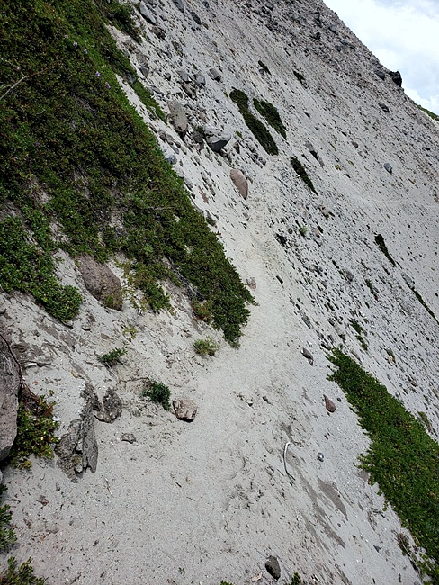 Nic netrvá věčně a dostáváme se na planinu. Přichází další řeka. Dostávám se přes ni. Za chvíli další, zdá se mi být větší a hlubší. Třetí je už slušný „veletok“, voda mi jde nad kolena. Začíná mi být celkem zima. Po krátkém odpočinku a sestupu následuje sedmikilometrové stoupání, které si příkrostí ničím nezadá s předchozím. Pohybuji se po skálách, srázy se střídají tu vlevo, tu vpravo. Mám krásný výhled na Mr. Helens, ale moc ho nevnímám. Je to příliš nebezpečné, je zde mokro, neopatrnost by skončila tragicky. Začínám trochu šněrovat, ale silou vůle si zachovávám dostatek vědomí, abych sledoval stezku. Po krátkém klesání jsem na stanici Klickitat.